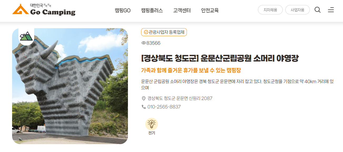 | 청도 운문산 오토캠핑장 | 청도군 운문면 | 35,000원 / 45,000원 | 전기, 샤워장, 매점, 숲속 사이트 | 조용한 휴식, 반려견 동반 가능 |